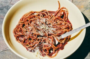 Pecorino, spaghetti, black pepper, and a whole bottle of red wine is the Molly Baz way.