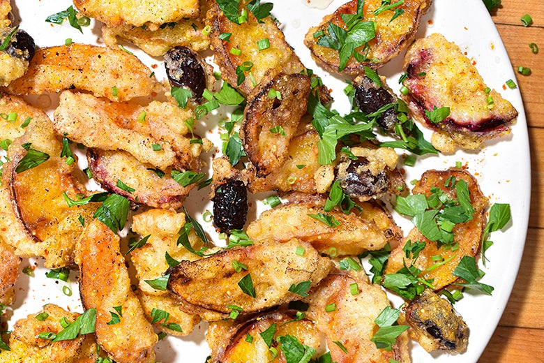 Cooking Unripe Fruit? Make Fritto Misto. Fry those firm peaches, nectarines, and pluots with halloumi and olives for the perfect salty-sweet snack. Story: Christian Reynoso
