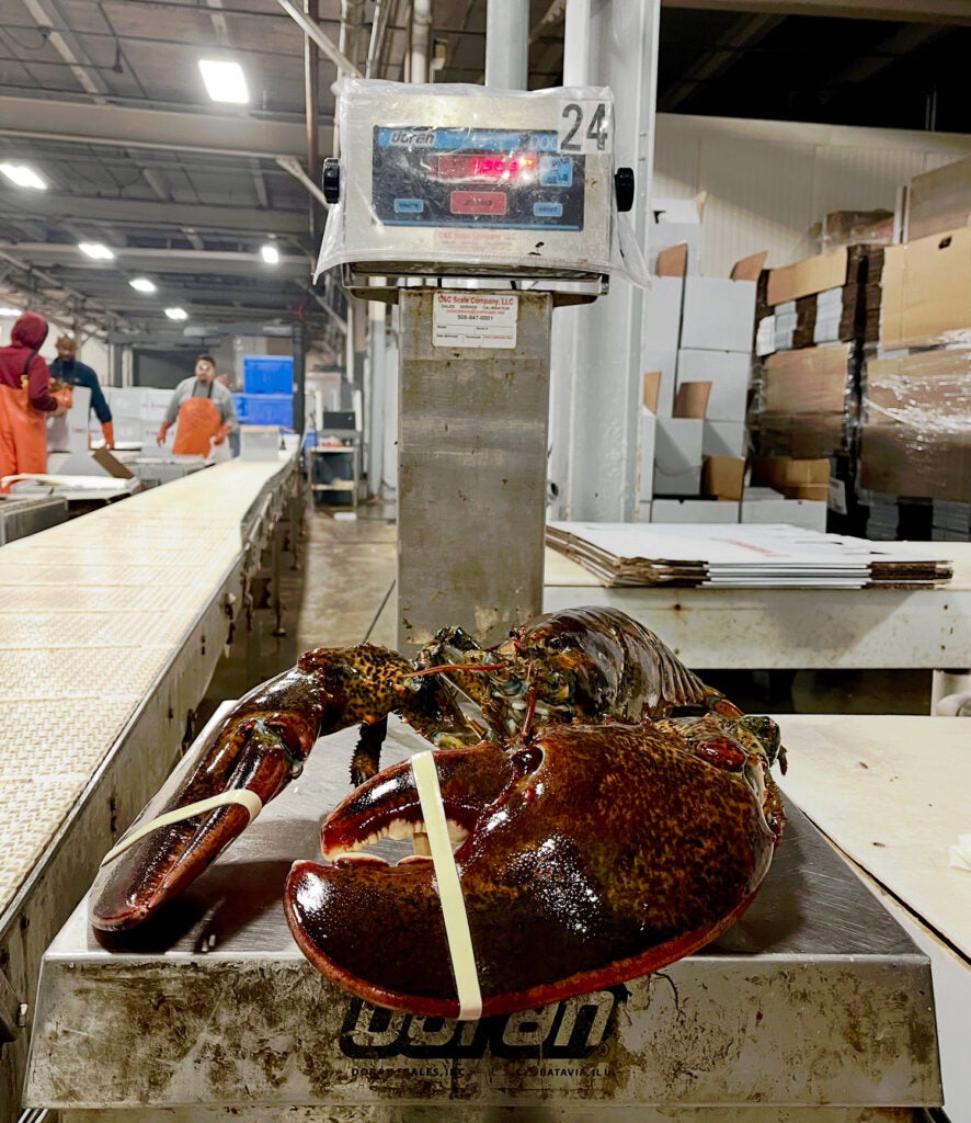 An enormous lobster gets weighed at Ready Seafood in Portland.