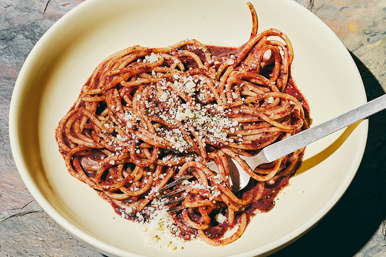 Cooking A Cacio e Pepe Gets Drunk and Breaks the Rules Pecorino, spaghetti, black pepper, and a whole bottle of red wine is the Molly Baz way. Story: Rachel Sugar
