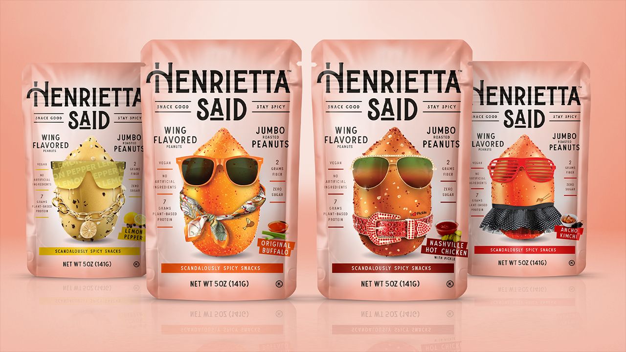 “Maybe hikers ate them. We still have a lot of the original mixes they created, with nuts and seeds, and we kind of evolved them since then,” says Lisa Smith, director of marketing for Truly Good Foods today, which sells mixes like Chile Mango Tango (cashews, dried mango, and chile de árbol butter-toasted peanuts) and So Gouda Keto (almonds, walnuts, and dried cheese bits) to wholesale customers like bulk grocery stores and airlines. The company is now owned by the Yorks’ daughters, Carolyn Bennett and Angela Bauer. And this year, they launched their first consumer packaged goods brand, Henrietta Said. Its specialty? “Scandalously spicy” jumbo Virginia peanuts, in a line of wing-centric flavors like Ancho Kimchi, Nashville Hot Chicken, and Classic Buffalo. Despite the association with chicken, each is vegan.