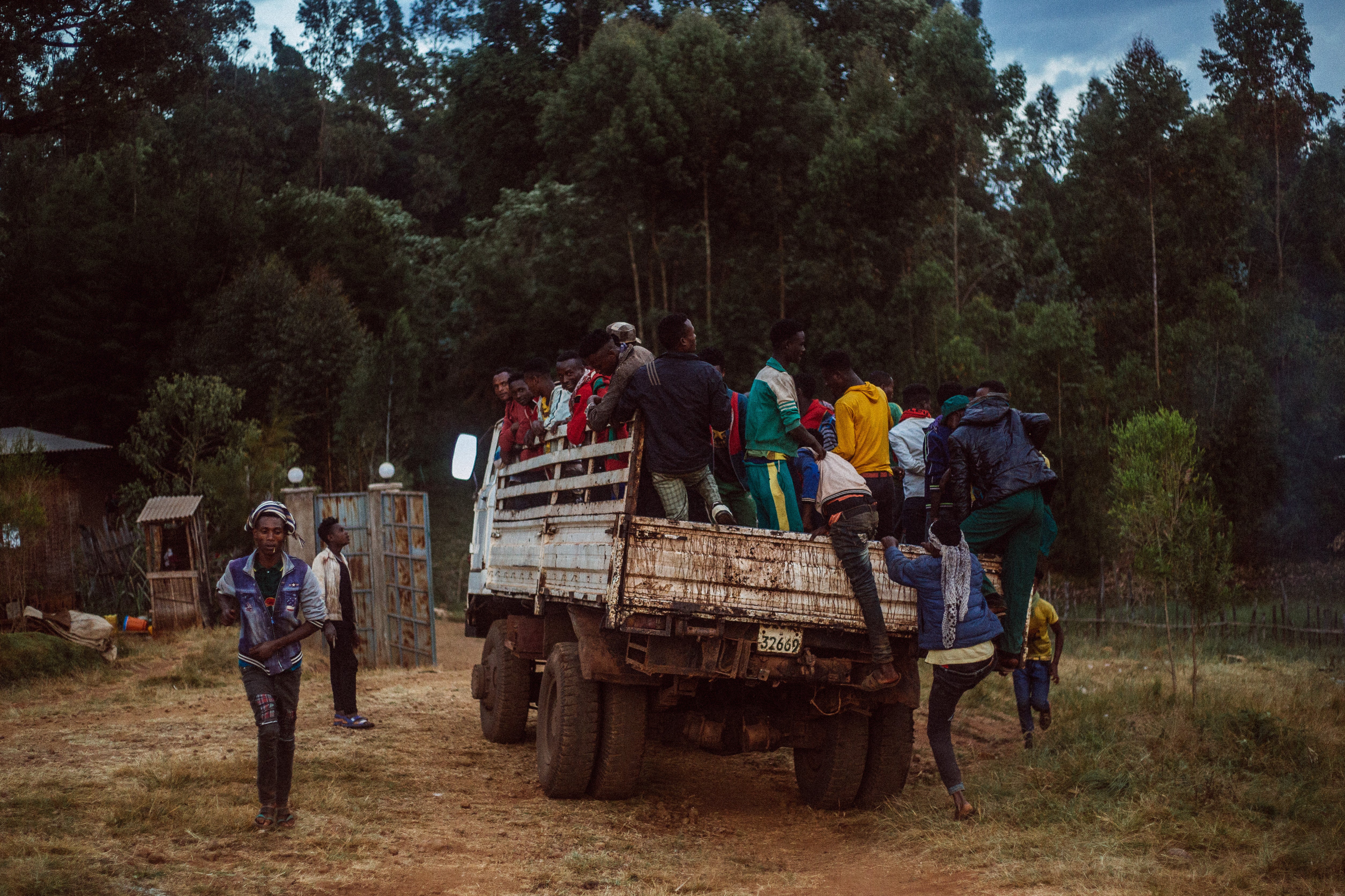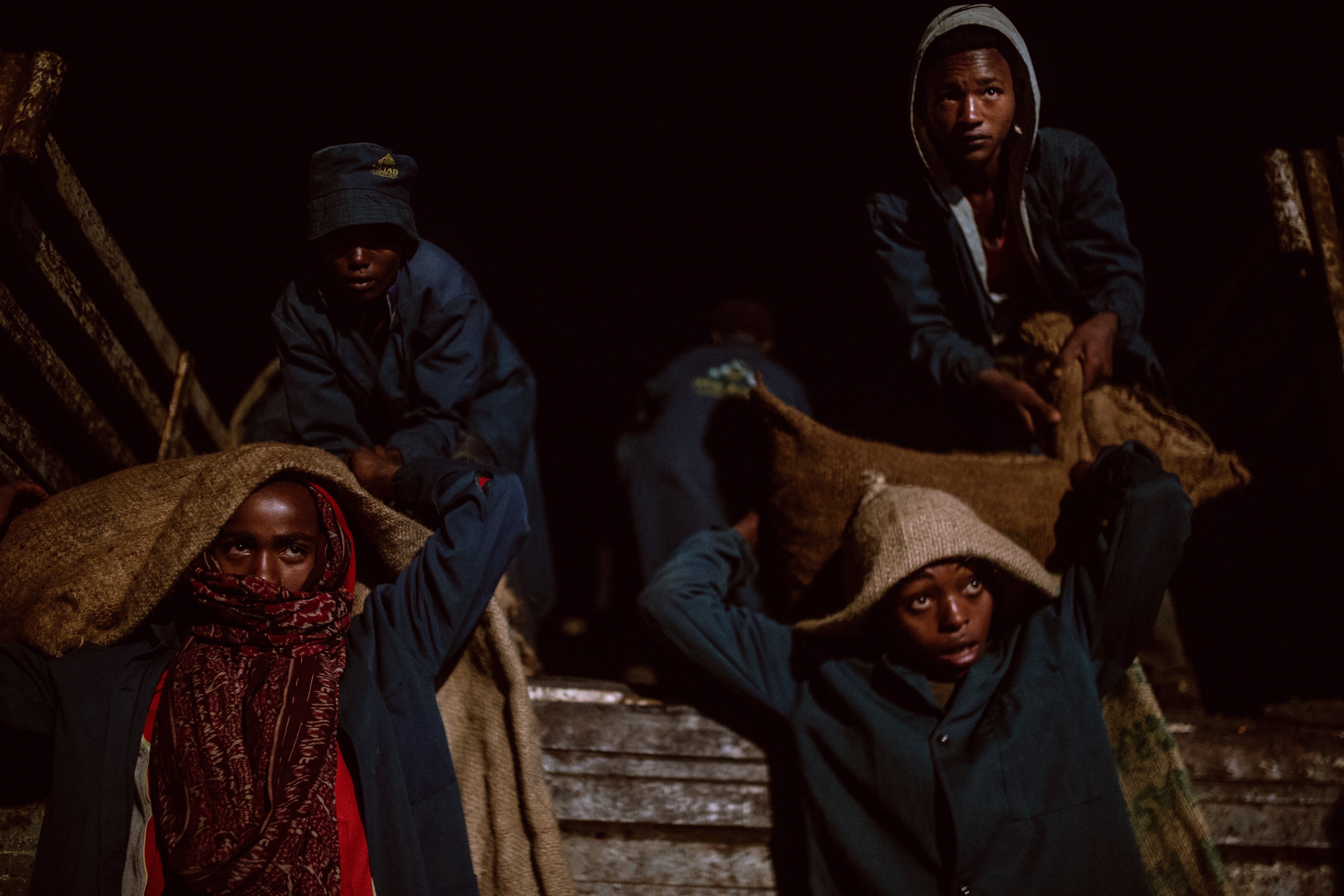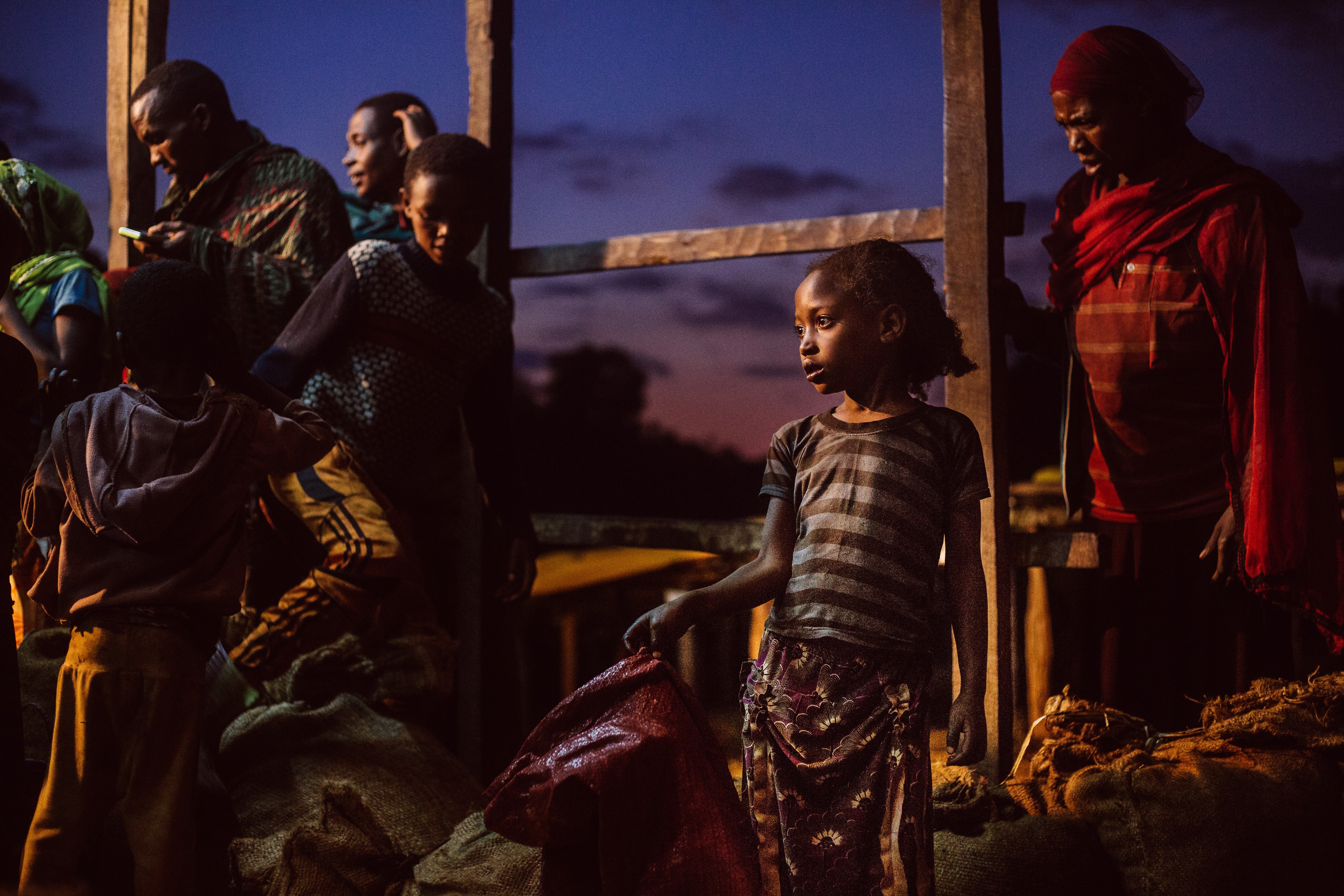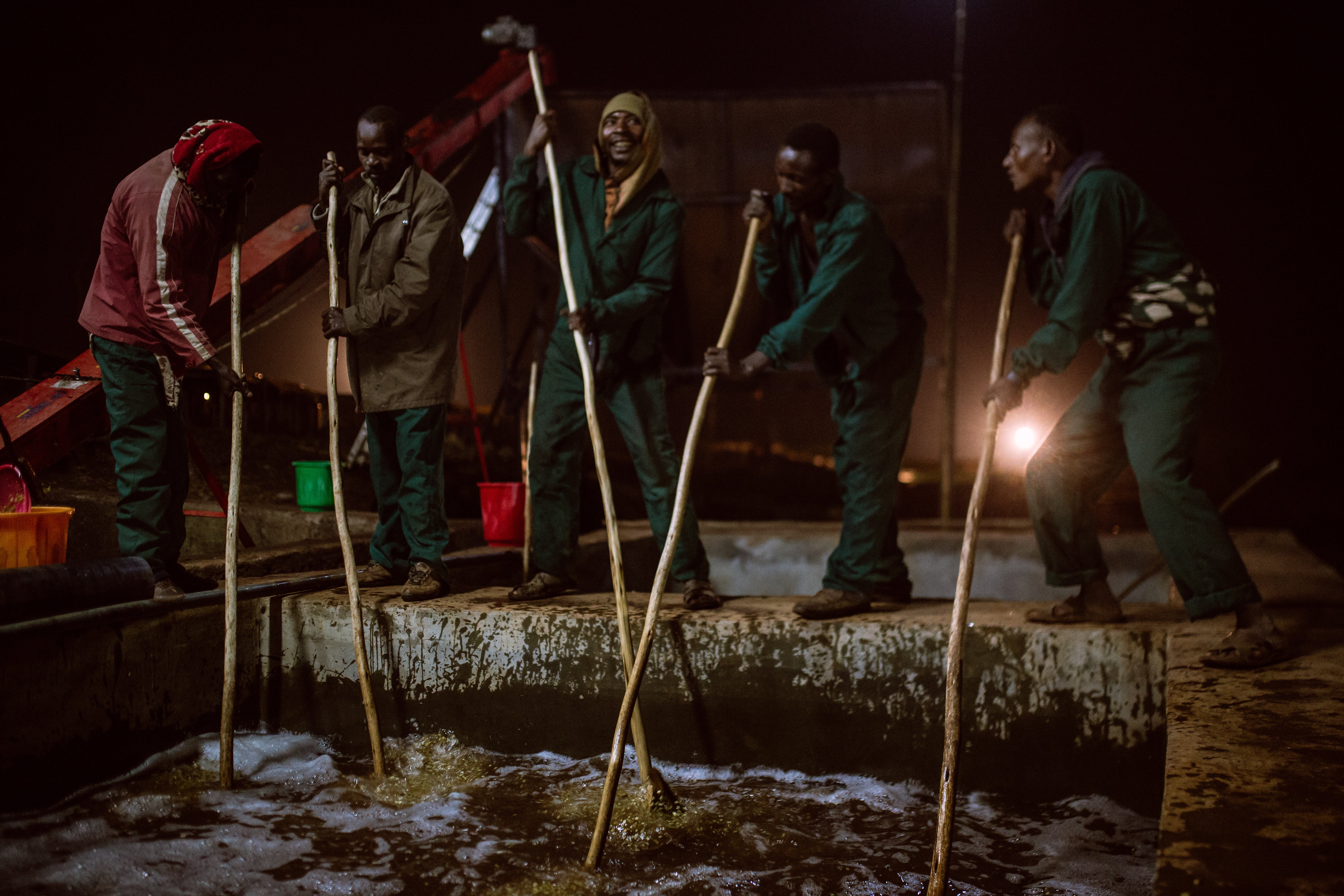 The weather is crisp and dry, like a fall night in Los Angeles, and workers wear a mix of coveralls—provided by METAD, the Addis-based company that operates Alaka—and fashionable streetwear. Fitted jeans, fake-leather jackets, logo sweatshirts for American basketball and U.K. football teams. The workers crowd around the actual washing station, which is wall-less structure with a 12-foot-high tin roof and fluorescent lights turned on to fight the approaching darkness. A line has formed; on one night it stretched to more than 20 farmers waiting patiently.