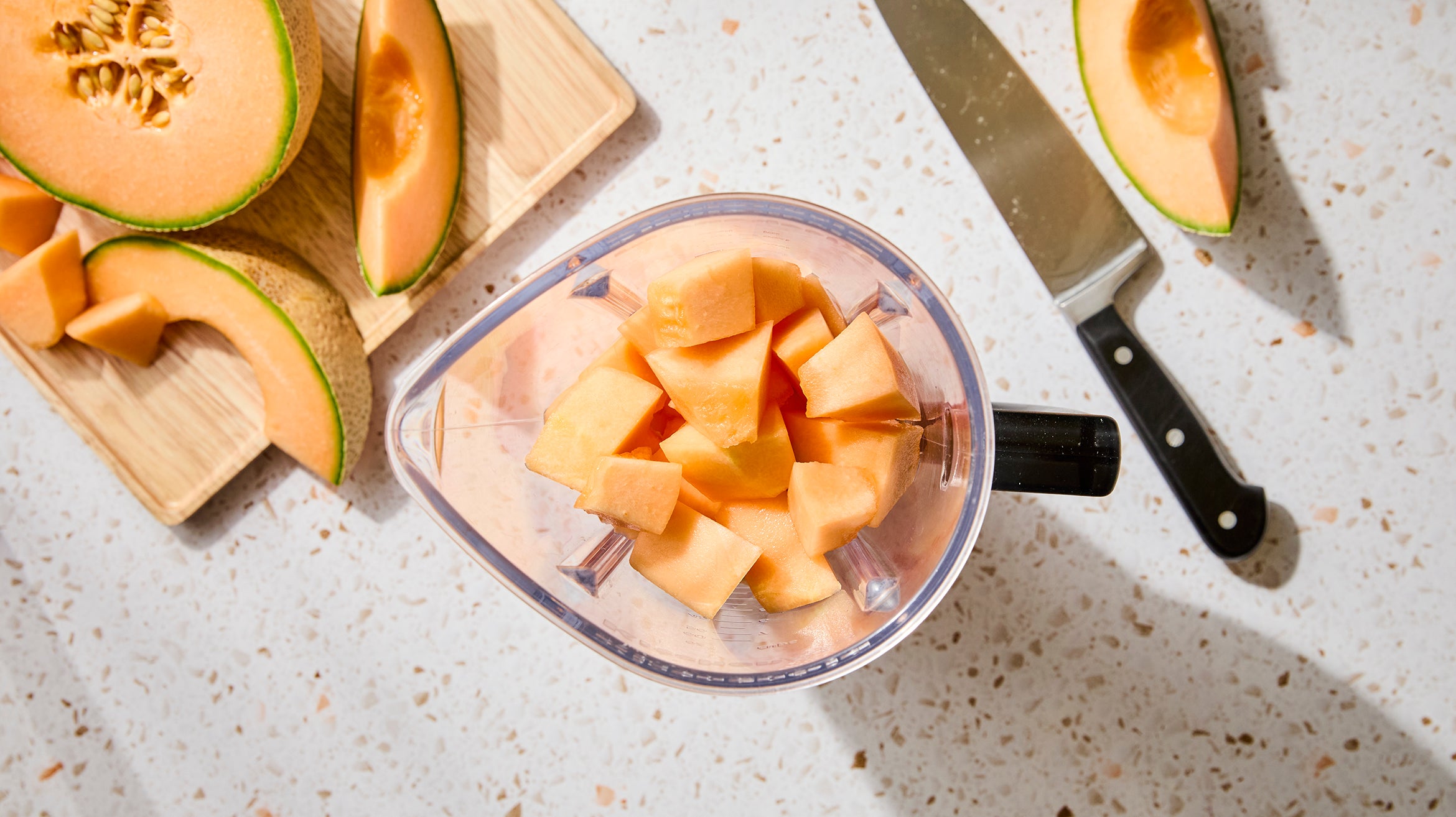 A ripe cantaloupe is intensely sweet, floral, and needs nothing more than a sprinkle of salt to achieve the status of summer fruit perfection. However, it’s important to remember that temperature significantly alters the way we taste food; when frozen, that intense cantaloupe flavor becomes somewhat muted. Just a sprinkle of sugar and a small squeeze of lime juice adds enough brightness to open the flavor back up. That said, be sure to taste your melon before adding sugar, as the sweetness can vary—a few tablespoons should be more than sufficient. You’ll know you’ve nailed the amount if the mixture tastes barely too sweet before freezing it.