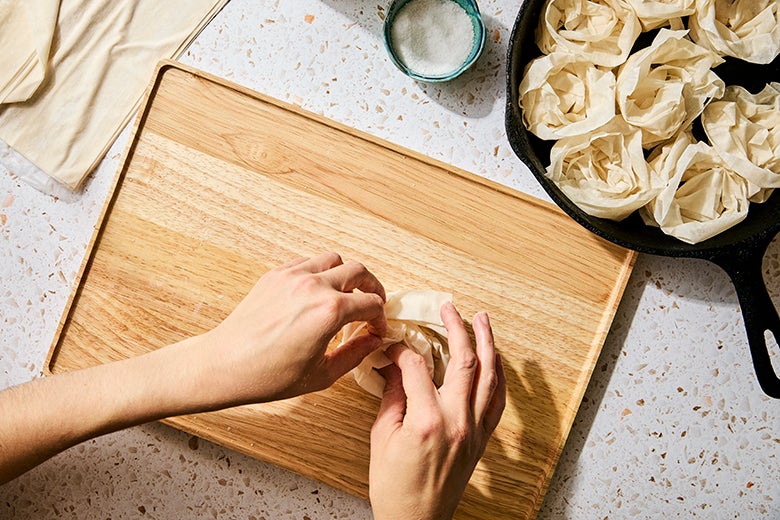 The dramatic presentation of this egg bake comes down to the phyllo rosettes. Before you start rolling, brush each piece of pastry with a thin coating of olive oil, then sprinkle it with salt (this makes it extra crispy and tasty). Next you’re going to scrunch the phyllo into a long strip so that it folds like an accordion. Finally, roll this up loosely to create a rough swirl shape (it doesn’t have to be perfect) and place it in an oven-safe skillet. You’ll be able to fit about nine rosettes in the pan.