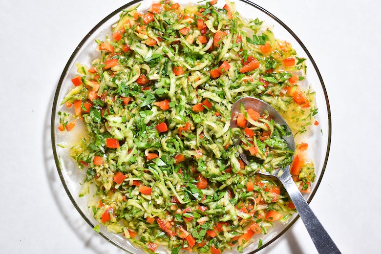 Cooking Grate Some Cukes, Make Some Slaw This green slaw dressed with garlicky tomato vinaigrette belongs on every summer plate. Story: Christian Reynoso