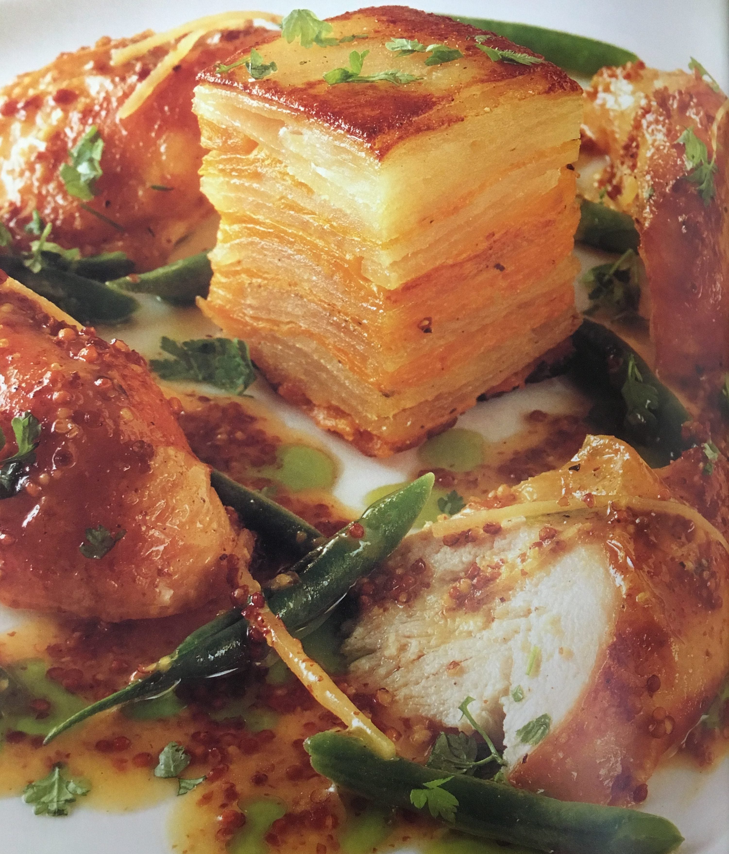 A recipe for roasted cornish game hen with potato pavé from The Kitchen Sessions by Charlie Trotter