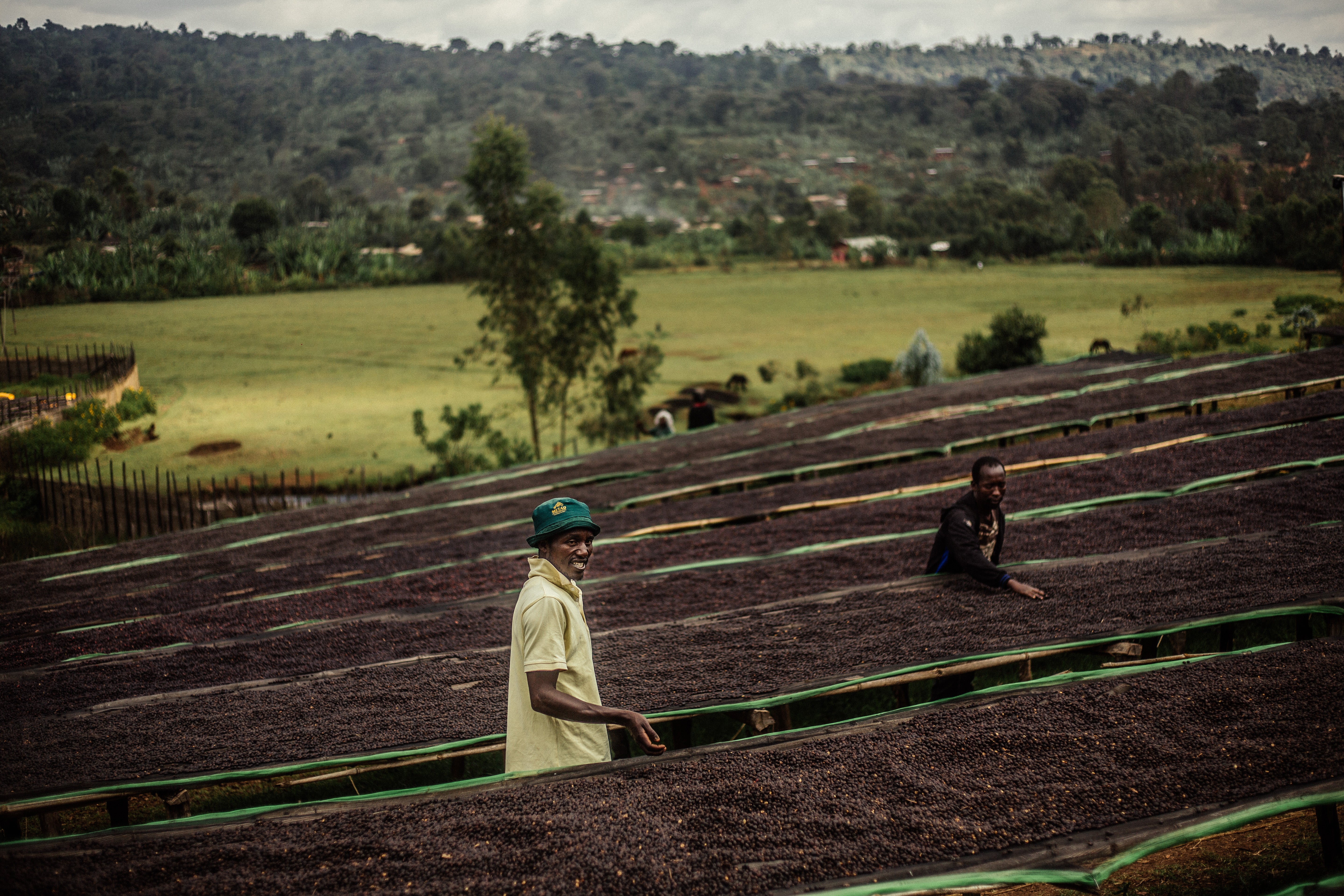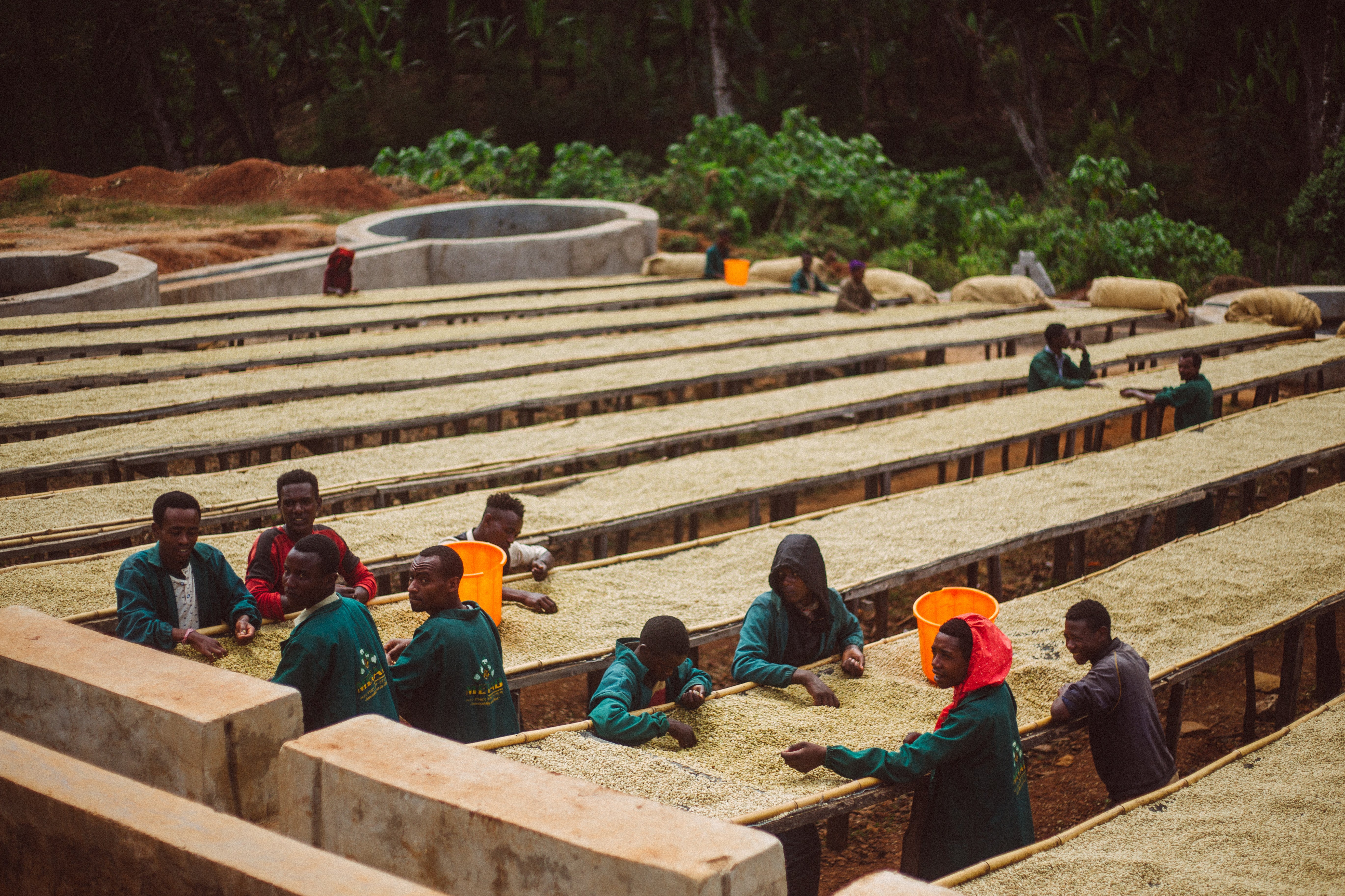 On the flip side is processed, or washed, coffee. Washing is how most coffee is produced around the world—in coffee-growing regions like Peru, Bolivia, and most of Central America —and gets coffee more to the middle-of-the-road form. Some of the steps in the process are similar to naturals, but with some extra steps. The cherry is purchased by Haile, sorted, and instead of being sent directly to the tables to dry, it’s forced through a machine that strips the coffee of its slimy pulp. The drupe (what we come to call beans) still have a coating of mucilage and are soaked in large tanks of water for one to two days of fermentation, then placed on large drying tables for additional drying (8 to 15 days).