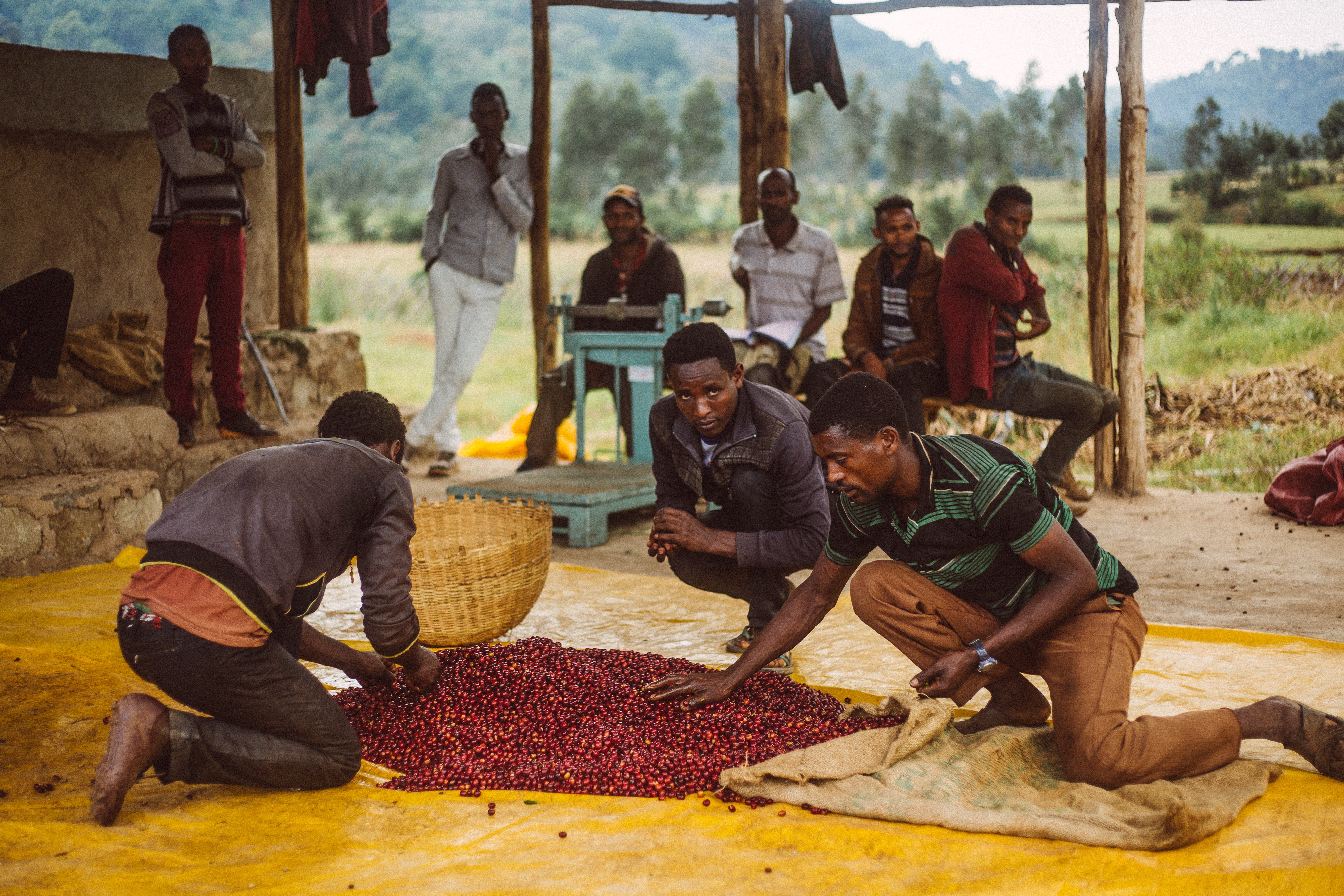 The colorful coffees are called naturals and, as the name suggests, are less processed than other coffees; in recent years they have been widely celebrated in specialty coffee. The cherry that is bought by Haile at the washing station is sorted for debris and placed on the tables. At night they are covered, but during the day the coffee is left to dry in the sun—though it’s covered during the peak of the afternoon heat—agitated every one to two hours by a legion of workers. Over time in the sun (around 10 days to as many as 25), natural processing separates the seed from the pulp, and the seeds (what we call coffee beans) are pulled from the tables and hulled of their thin shell, either on or near the farm.