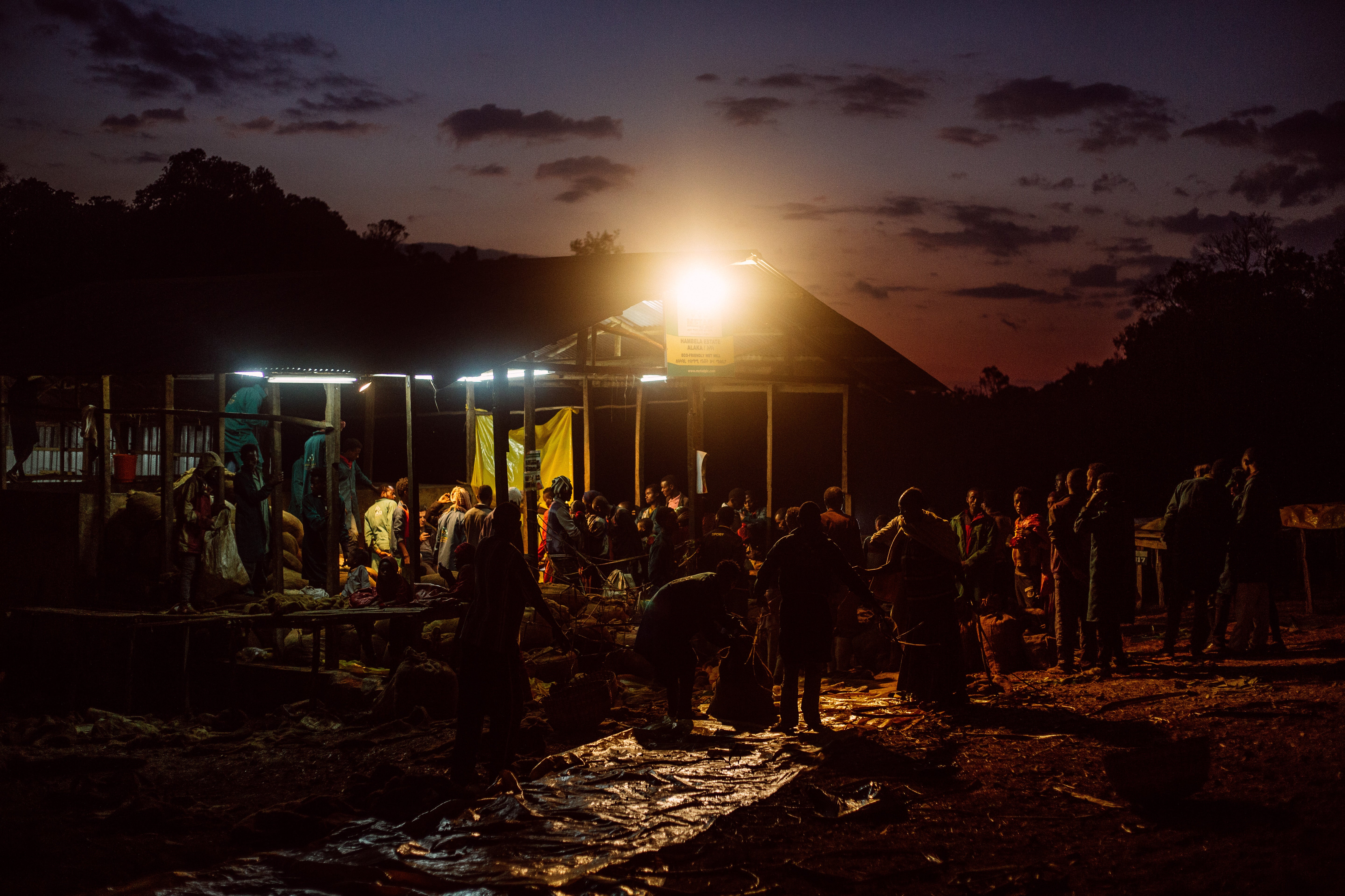The weather is crisp and dry, like a fall night in Los Angeles, and workers wear a mix of coveralls—provided by METAD, the Addis-based company that operates Alaka—and fashionable streetwear. Fitted jeans, fake-leather jackets, logo sweatshirts for American basketball and U.K. football teams. The workers crowd around the actual washing station, which is wall-less structure with a 12-foot-high tin roof and fluorescent lights turned on to fight the approaching darkness. A line has formed; on one night it stretched to more than 20 farmers waiting patiently.