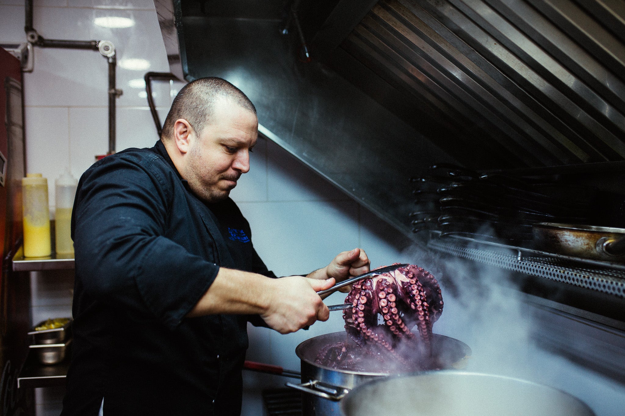 It was during this time in India that Jeremias ignited a passion for cooking, especially his unique manipulation of fresh seafood. In Goa, he cooked prawns, shark, and mackerel—using the local fish market as the paint to his nightly canvas. It was also when the young cook grew to love the fiery chiles that accent some of his popular dishes today. He ended his trip in remote Nepal. “It’s a sad story, and if you have time later, I’ll tell you,” he says with a long pause. “I came back to Israel on Monday. On Friday I went to a party. I met my neighbor and told her I’m going to marry her, and that’s it. Forty-eight years have lapsed, and here we are.”